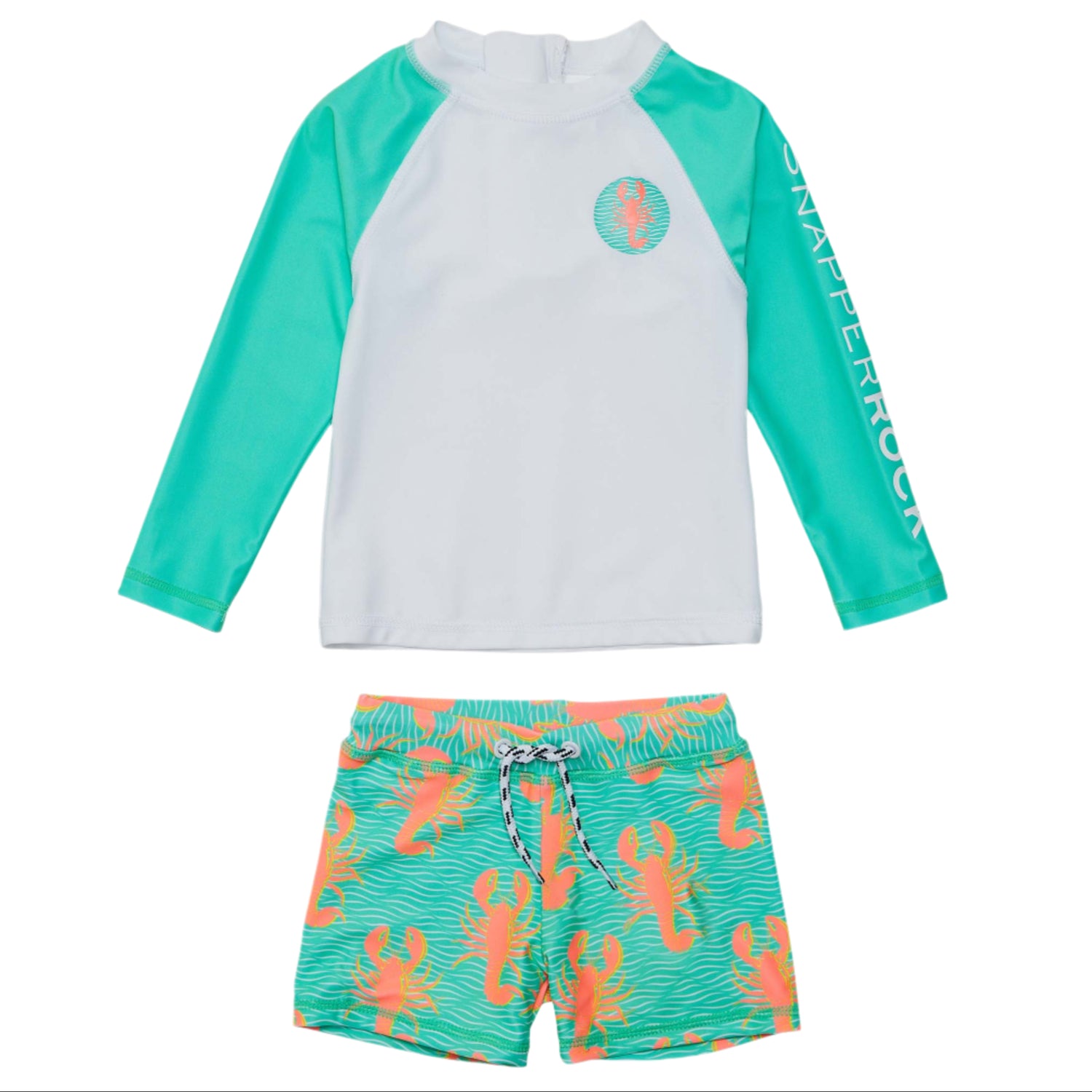 Gear up for aquatic adventures with this sun-protective rash guard top and shorts. The set features a crisp white rash top with mint sleeves and a seamless white zip, paired with lobster print swim shorts equipped with a navy and white fleck drawcord. This ensemble is perfect for active beach days.