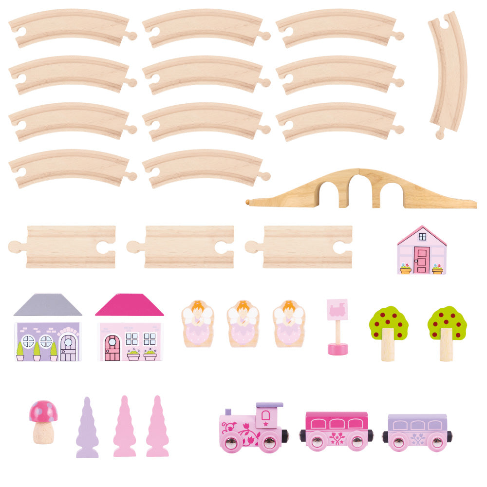 Choo-choo! The Fairy Pink Train Set is ready to depart to a magical fairytale land far, far away. Pinks, pastels and fairy figures feature extensively in this bright and wonderful wooden train set.