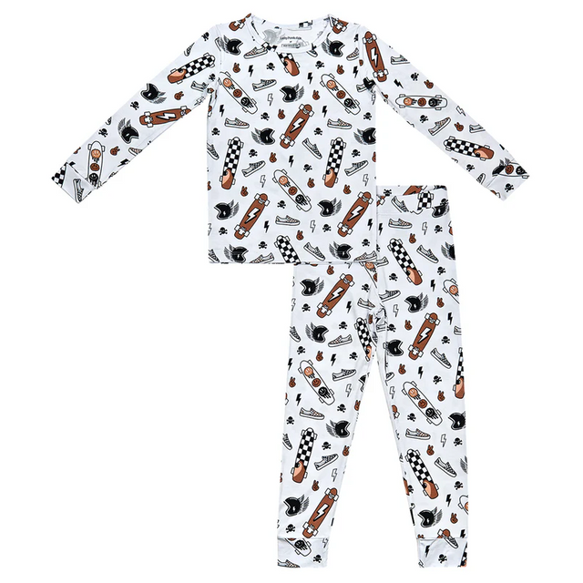 Meet the Bamboo Two Piece Set | Sk8er—featuring playful skateboards, tiny sneakers, and bold graphic pops that bring street-style energy to every move.