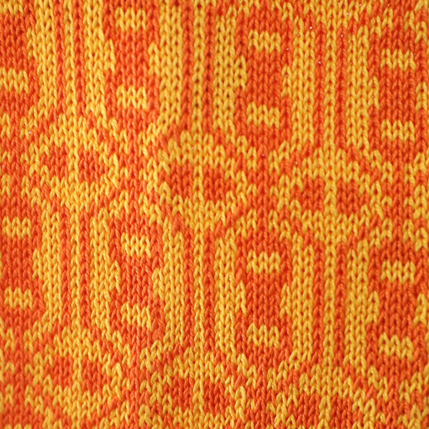 Add a burst of color and festive cheer into your holiday décor with this vibrant knit holiday stocking. This stocking features a bold and intricate pattern in warm orange and yellow tones, creating a lively and inviting aesthetic. The bright blue cuff is adorned with a delicate snowflake motif, adding a touch of winter wonder, while the green and blue striped heel and toe, accented with orange, provide a playful and dynamic contrast.