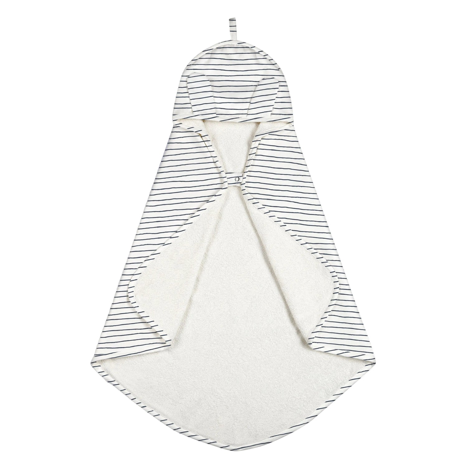 Wrap little ones up nice and snug with this soft and luxuriously fluffy eco-friendly organic cotton hooded bath towel. Every last design detail was considered for a joyous bath time, from the playful stripes on the hood & border to the matching hanging loop, we love. Super size super nice - this hooded towel covers the baby & toddler from head to toe. Woven with purest non toxic organic cotton for an incredibly smooth texture. It’s super plush and absorbent, with a lofty weight that doesn’t feel bulky.