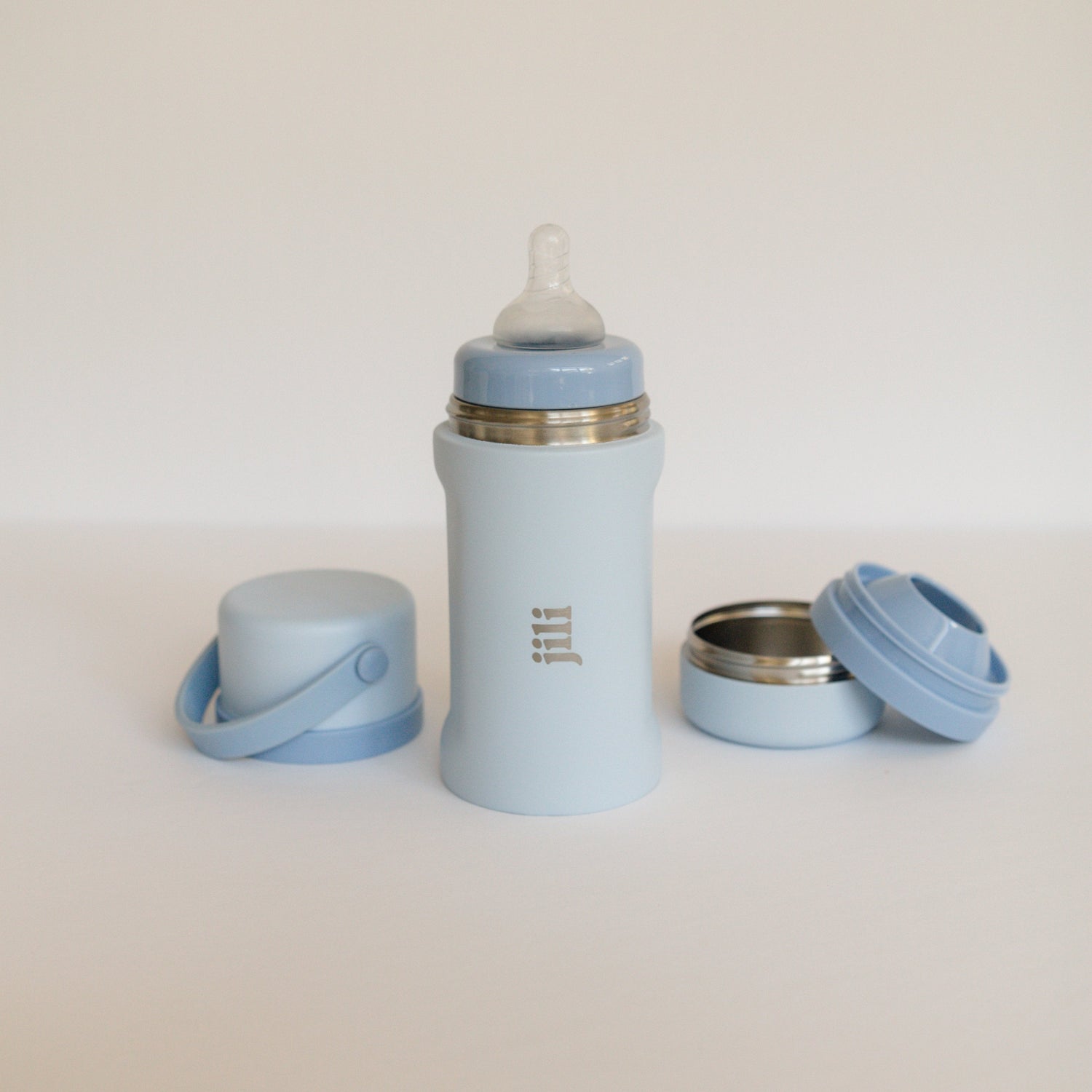 Introducing the Jili All-In-One Baby Bottle in Ice - the perfect solution for parents on the go. This insulated baby bottle is a must-have for travel, as it keeps water warm for up to 8 hours, making feeding time a breeze no matter where you are. Say goodbye to the hassle of finding warm water for your baby's formula, and enjoy the convenience of our the Jili bottle for all day feeding on-the-go. Whether you're heading out for the day or embarking on a weekend getaway, the Jili bottle has got you covered.