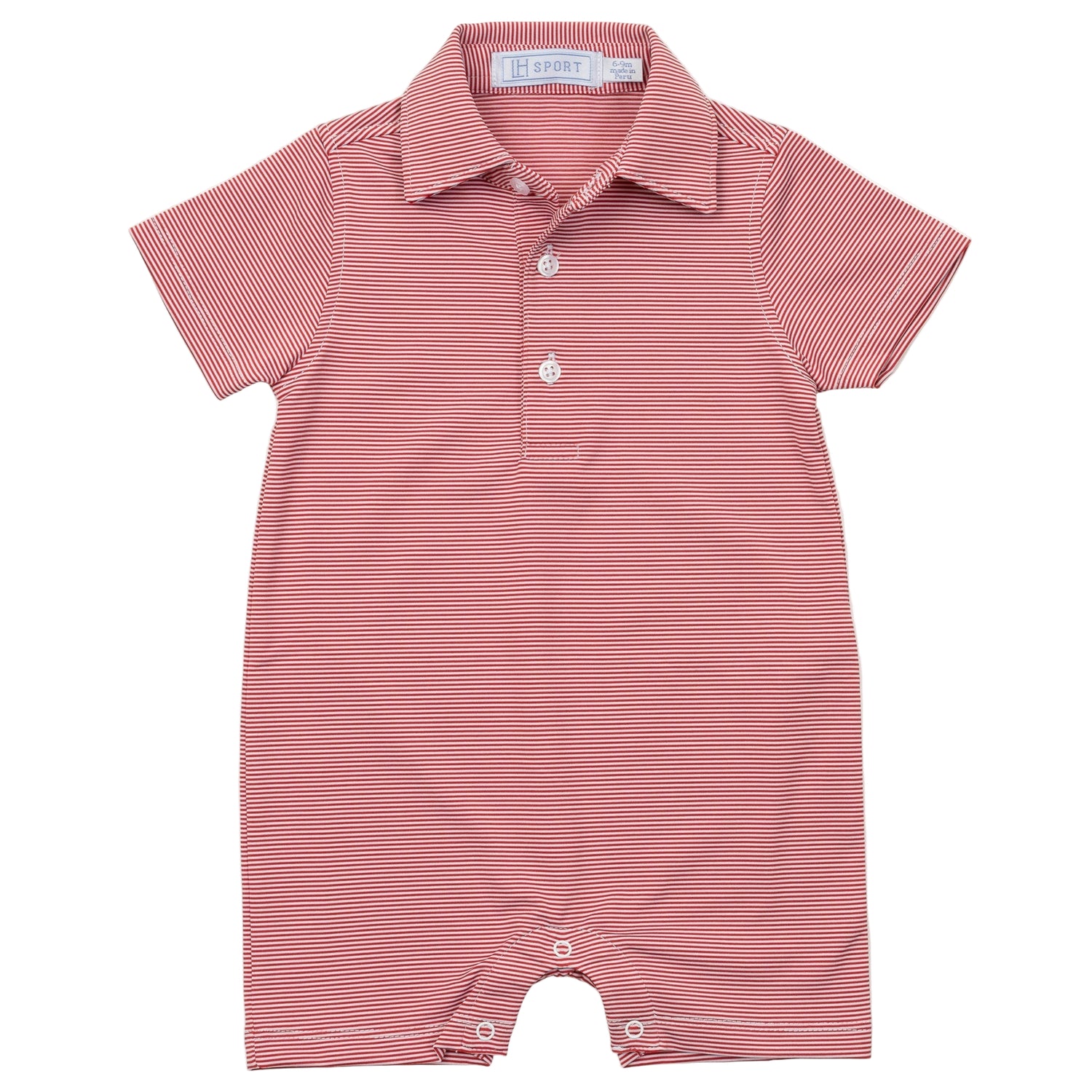 Short sleeve performance polo-style shortall with button front and three snap closure in stride. Coordinates perfectly with the Will golf shirt for the older boys. Made from 92% polyester, 8% Elastane. Moisture-wicking and quick-drying.