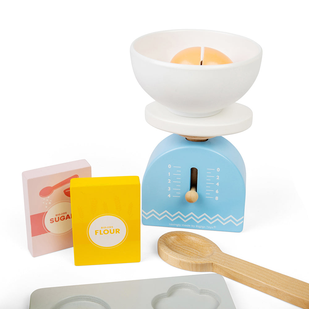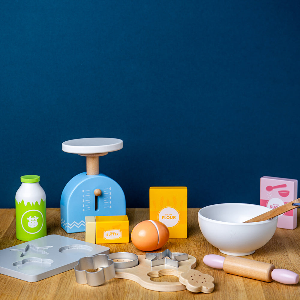 On your marks... get set... bake! Invite your little muffins to join you in the kitchen to make a (pretend) batch of cookies with their own miniature kids baking set. Our Baking Cookies kit is jam-packed with a wooden baking tray, kitchen scales, pastry cutters, a rolling pin, mixing bowl, sliceable butter, an egg, flour, sugar and milk.
