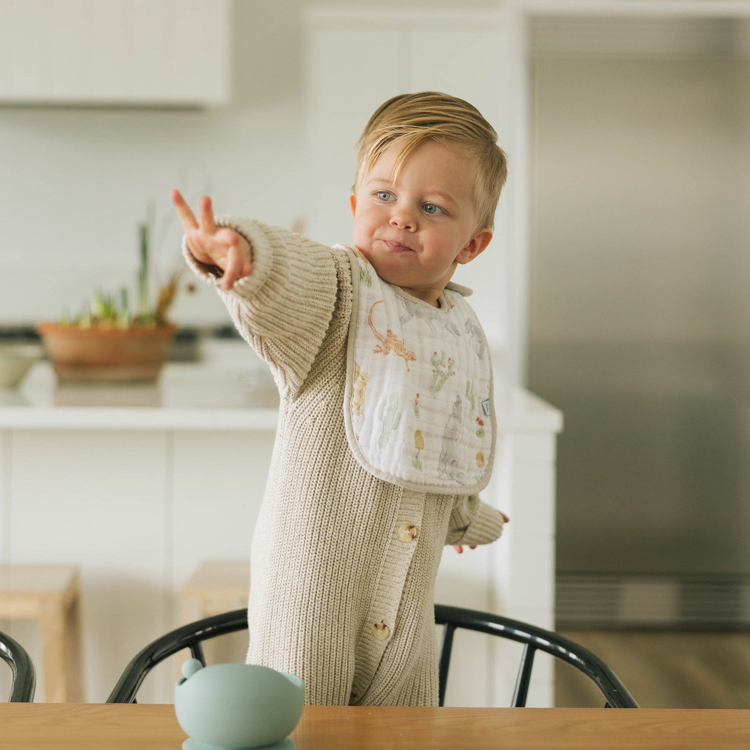Soft and absorbent, our multi-layer bibs are built to handle all of baby's spills and messes. Featuring three unique, hand-painted prints and a snap-on function to ensure a snug fit that grows with your baby.