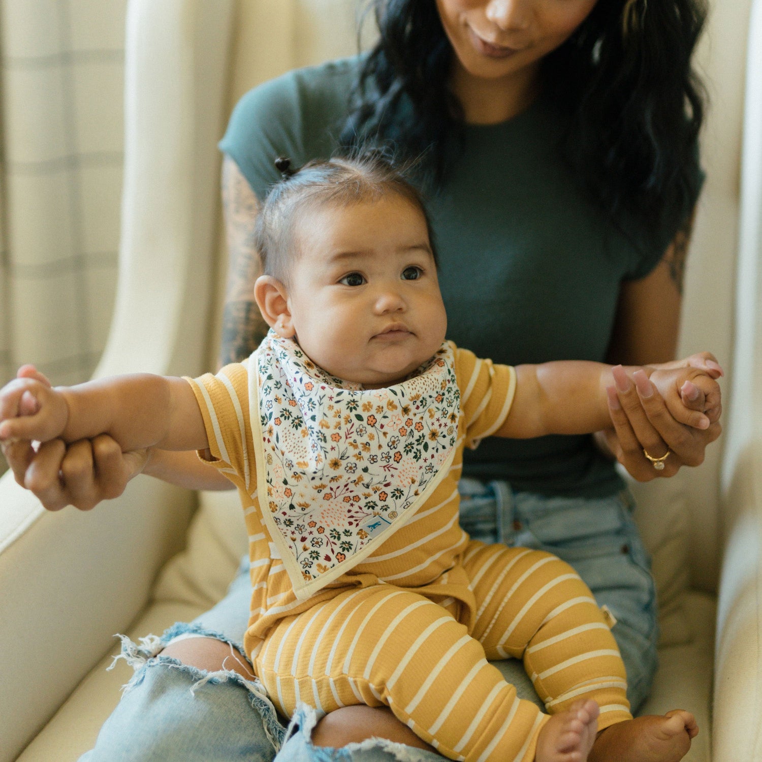 Cotton Muslin + Fleece Bandana Bib 4 Pack - Pressed Petals is backordered and will ship as soon as it is back in stock.