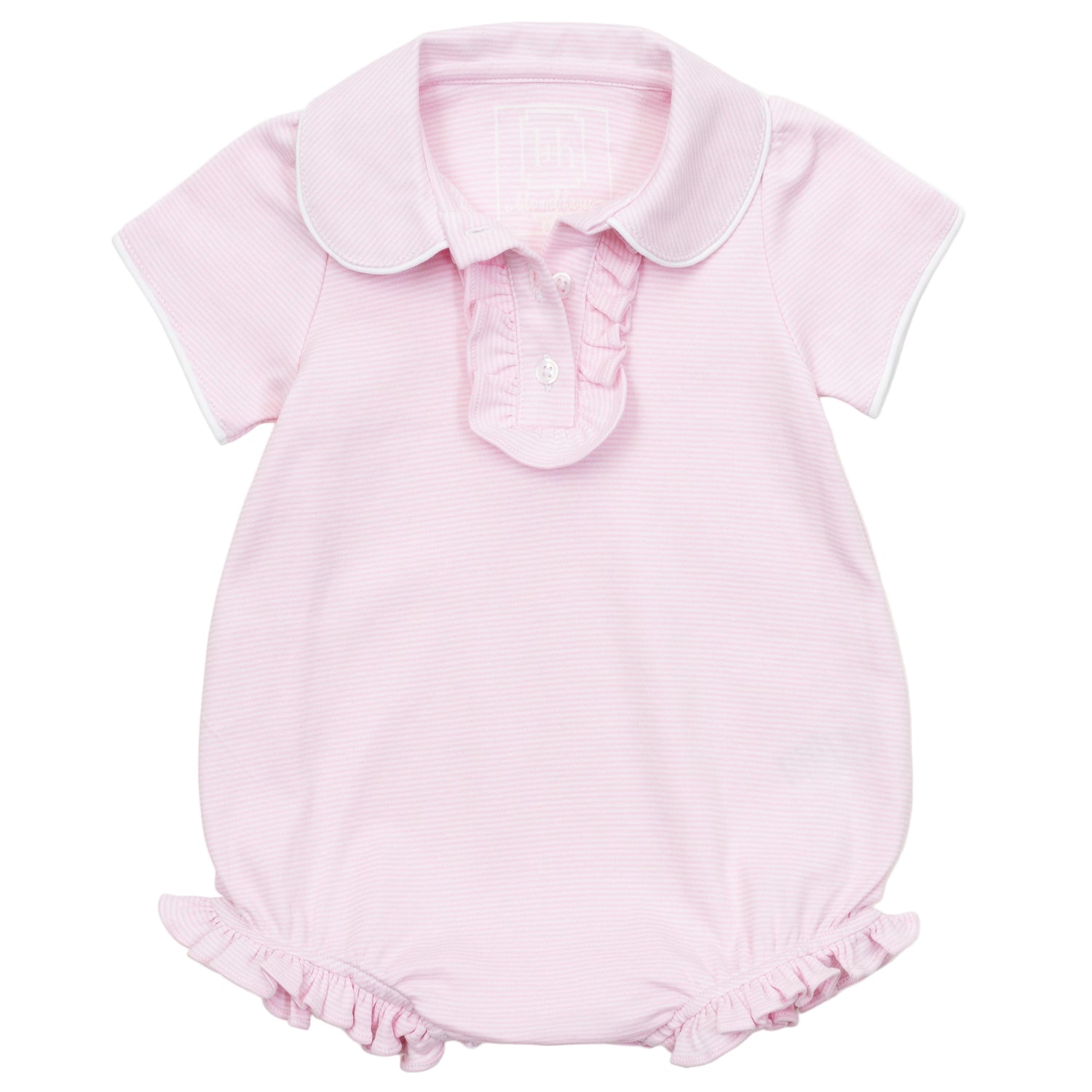 Girls' peter pan collar short sleeve pima bubble with ruffled button placket. Made from 100% Peruvian Cotton.