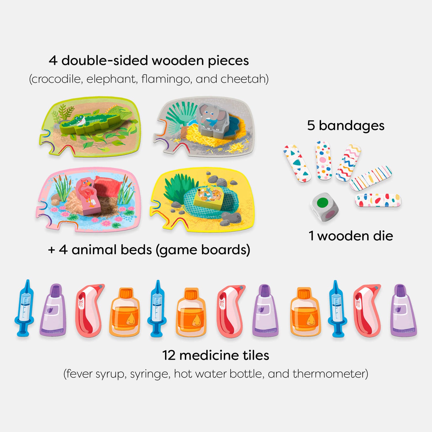 The animals need your help! It's time to treat the sick crocodile, elephant, cheetah, and flamingo. Each animal has a unique ailment, and it's up to the little veterinarians to provide the right care. Can you assign the correct medicine and be the first to heal all the animals?