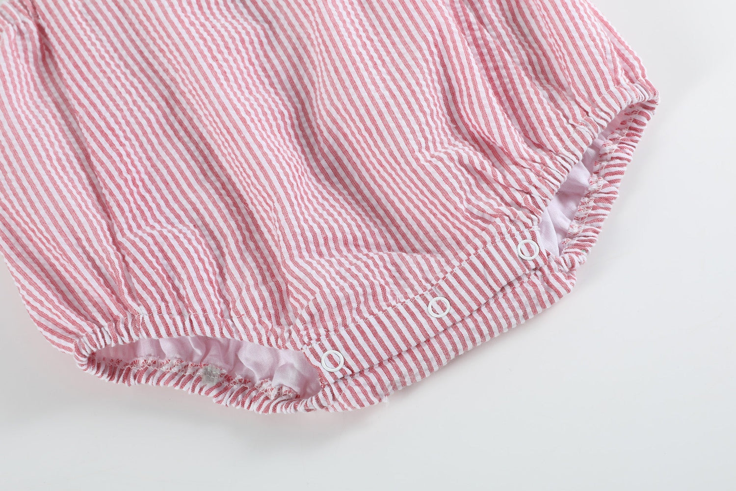 This Red Seersucker Strawberry Ruffle Romper is a sweet little treat for your little sweetie. Detailed with flutter sleeves, bow on the back and intricate strawberry appliqué will make your baby stand out in style!  Vibrant buttons at the shoulder allow for size adjustments and snaps on the crotch for easy diaper changes.