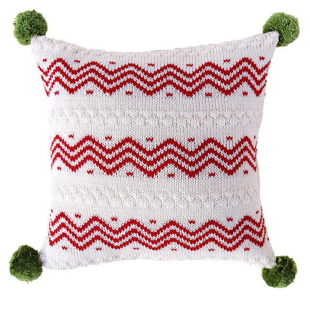 This knit holiday throw pillow brings a touch of festive charm to your home decor with its modern red and white zigzag pattern. The intricate knit design, paired with soft green pom-poms on each corner, adds a playful yet classic element to any room.